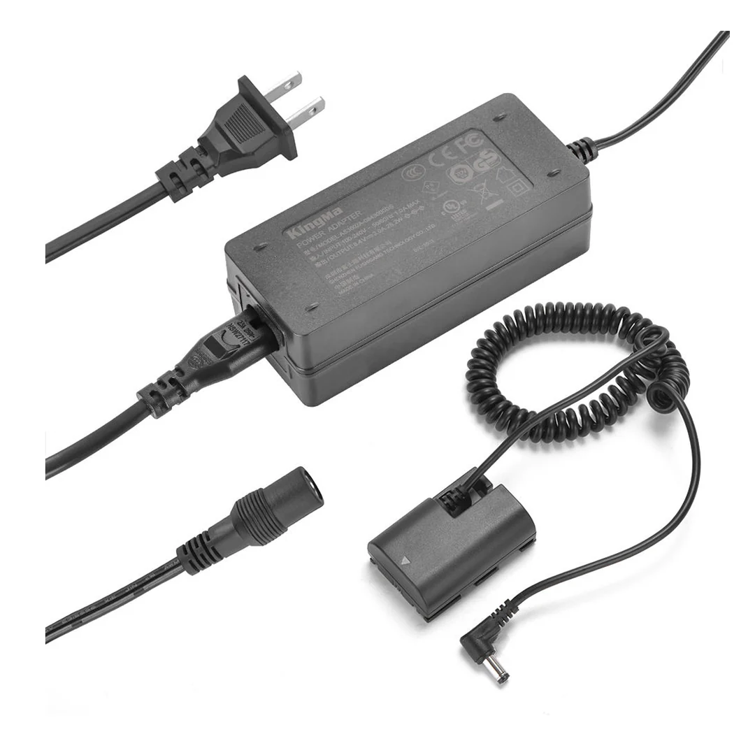 – Conecte el cable de alimentación y el acoplador de CC (batería ficticia DR-E8) al adaptador, y luego coloque el acoplador de CC en el compartimento de la batería. Asegúrate de que la tapa de la batería esté completamente cerrada y bloqueada después de poner la batería ficticia en el compartimento de la batería.