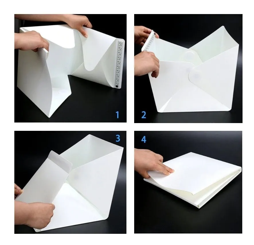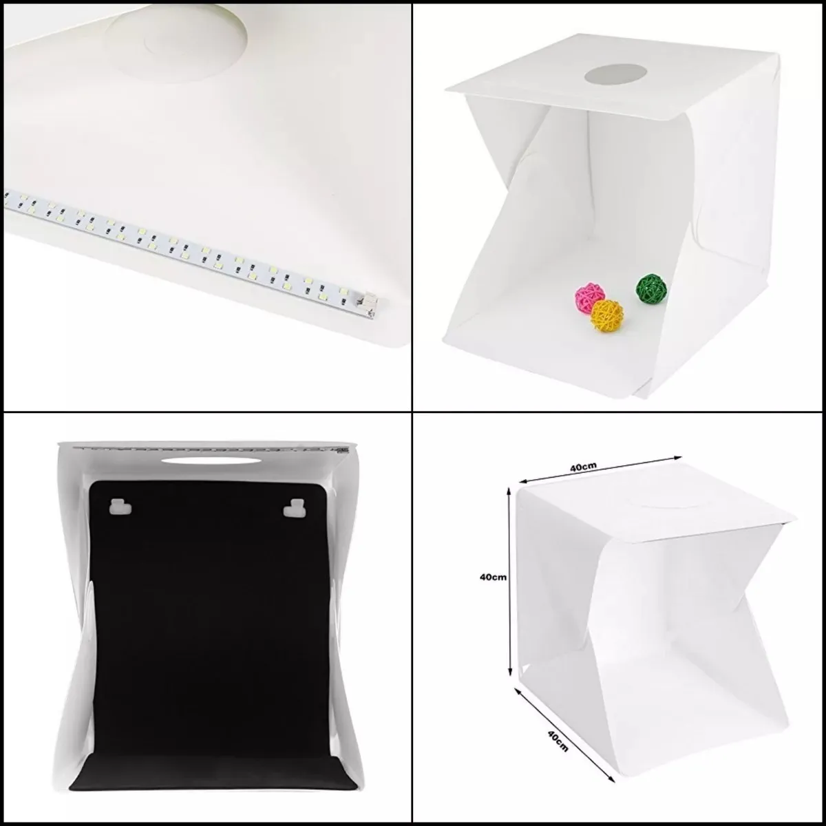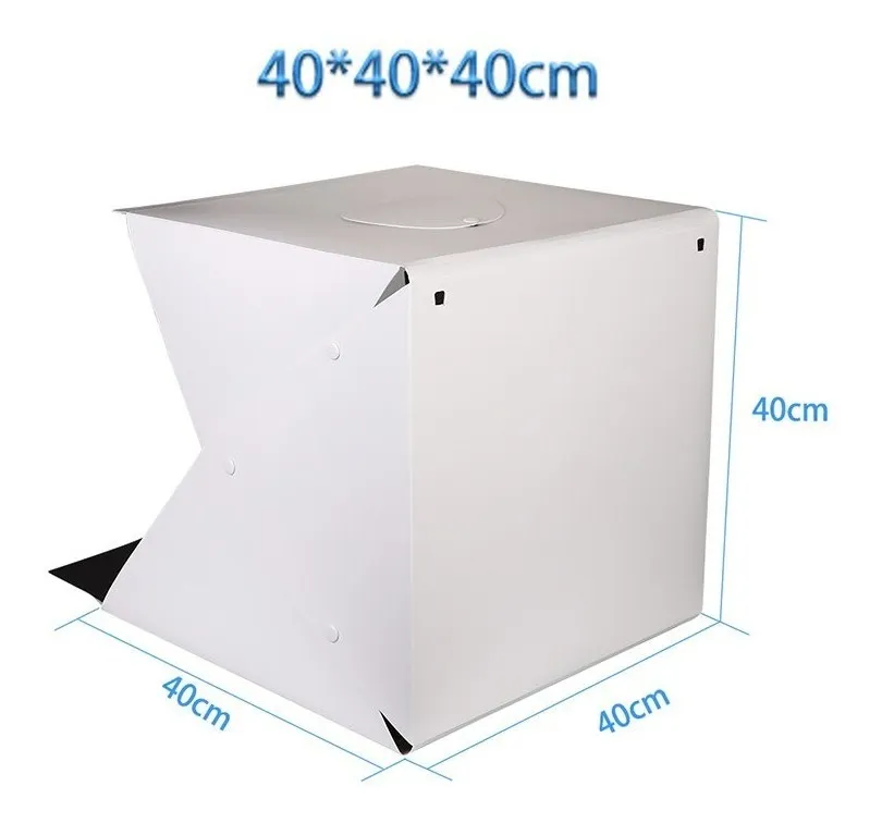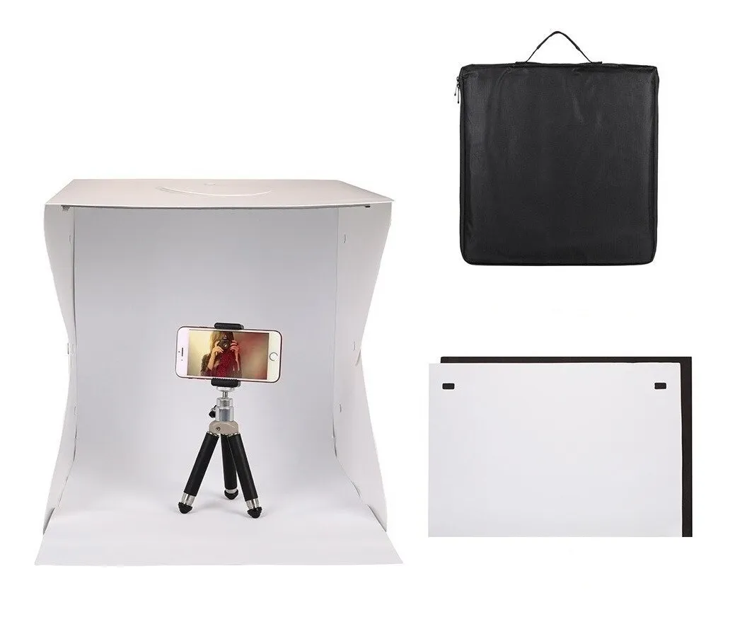 Caja Luz Softbox Fotográfica Portatil Ligth Box + 2 Leds + Bolso + Fondo Blanco + Fondo Negro en PVC Es 100% portátil ya que se pliega y entra en una mochila (al ser de acrílico conserva siempre su forma a diferencia de productos de cartón o tela que se deforman con el uso). – Fotografía productos rápido en cualquier lado y con minima edicion – Excelente producto para quienes venden por internet o les gusta retratar de la mejor manera aquellos objetos portales. – Tu propio estudio de foto producto en cualquier parte!!! CARACTERISTICAS • Caja de luz portatil USB. • Material: Plástico ABS + Acrilico • Color: Blanco • Energía: 5v. 1a. Medidas: 40 x 40 x 40 cm.