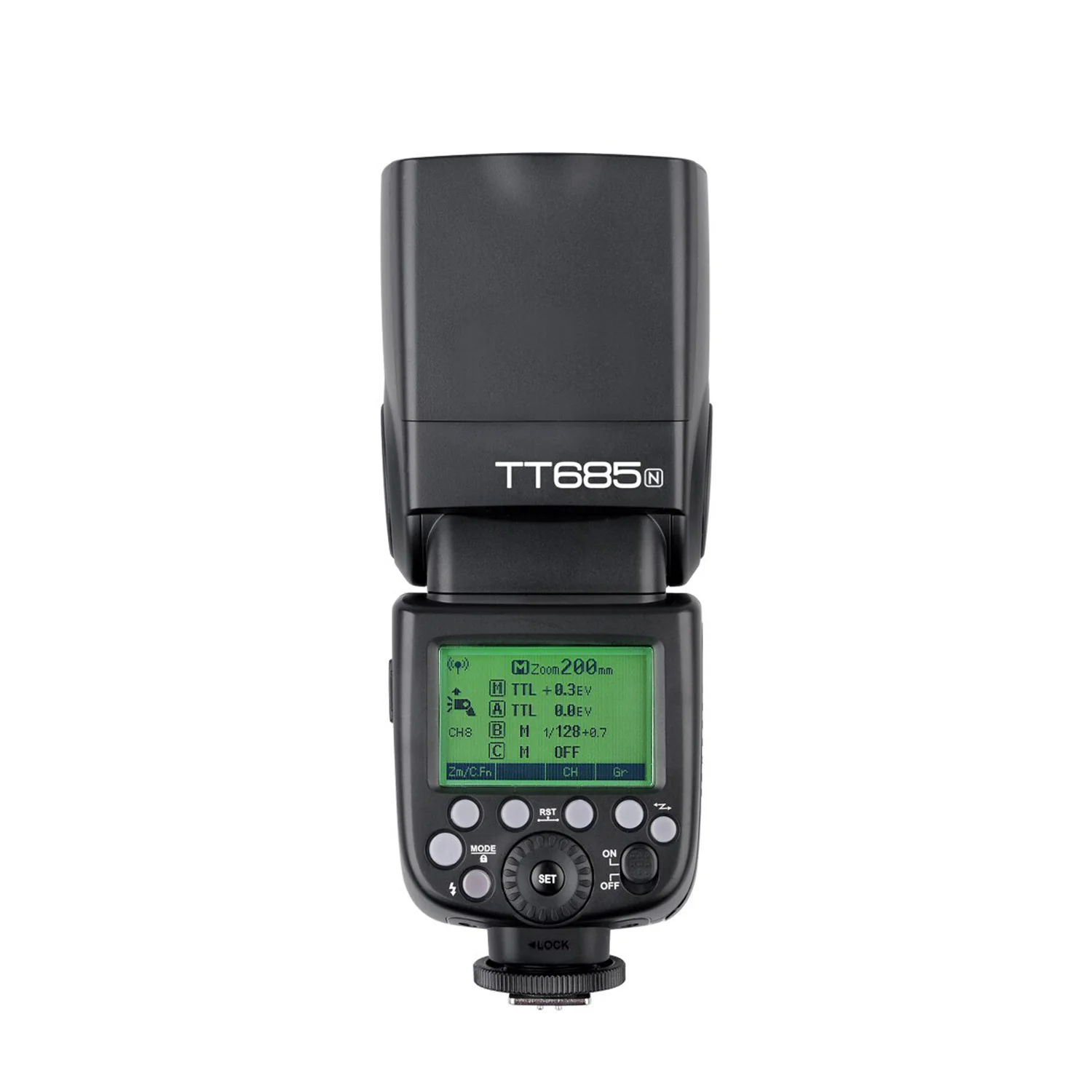 El TT685N II funciona como una unidad maestra o esclava inalámbrica completa con funcionalidad TTL, y para una máxima versatilidad, esta unidad actualizada se inclina de -7 a 120 ° y gira 330 °, lo que le brinda ángulos de flash más flexibles y un proceso de configuración de iluminación más eficiente.También se incluye una nueva y única función TCM (TTL Converted to Manual), que permite la conversión instantánea de TTL a modo manual. Esta función le ayuda a bloquear el valor de exposición adecuado y es útil para determinar rápidamente un buen punto de partida para configurar las unidades de flash externas en modo manual. Para facilitar su uso, un panel LCD trasero de fácil lectura ilumina la configuración del flash,