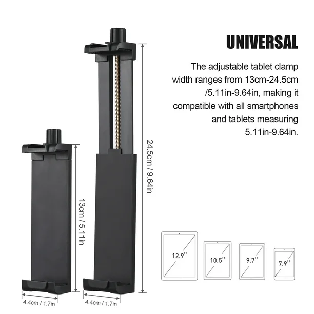 • Ajustable: Presenta un diseño expandible con mecanismos de clip en ambos extremos para sujetar dispositivos de diferentes tamaños, desde teléfonos hasta tabletas.