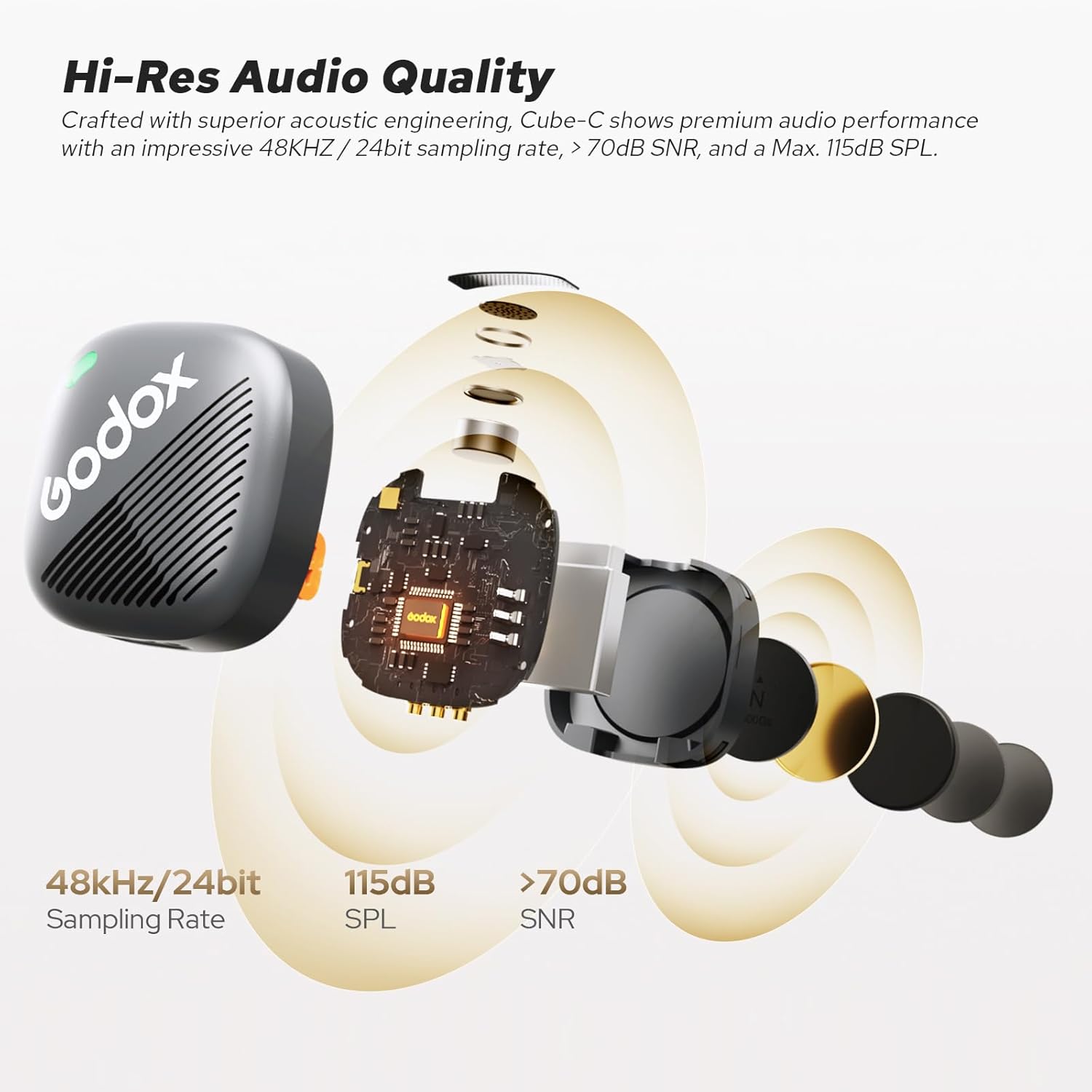Construido utilizando estándares superiores de ingeniería acústica, el pequeño micrófono inalámbrico Godox Cube-C ofrece un rendimiento de audio superior con una sorprendente frecuencia de muestreo de 48 kHz/24 bits, una relación señal-ruido (SNR) de >70 dB y un SPL máximo de 115 dB.