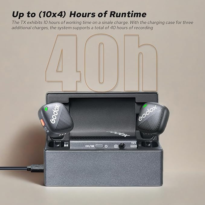 Cada transmisor y receptor puede funcionar hasta 10 horas con una sola carga, con la opción de 3 cargas adicionales mediante el estuche de carga opcional de 2300 mAh (disponible por separado). Este set de micrófono inalámbrico Godox ofrece un total combinado de hasta 40 horas de grabación, lo que le proporciona suficiente energía para un uso continuo.