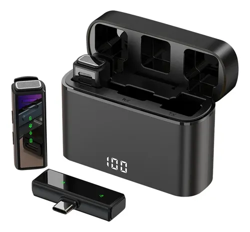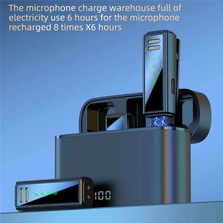 3. Estuche de carga portátil: Es un centro de almacenamiento y carga para micrófonos. La batería recargable incorporada de 600 mAh puede proporcionar hasta 8 cargas completas para 2 micrófonos y admite el uso continuo del transmisor durante 4-6 horas cuando está completamente cargada.