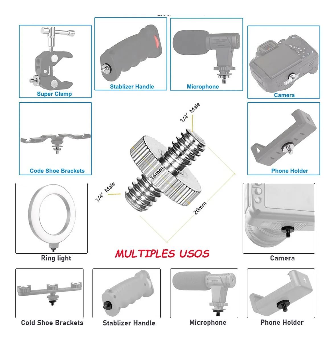 1. Unión de Trípodes: Permite montar cámaras, luces o micrófonos sobre trípodes, monopies o rótulas que tengan entrada de 1/4